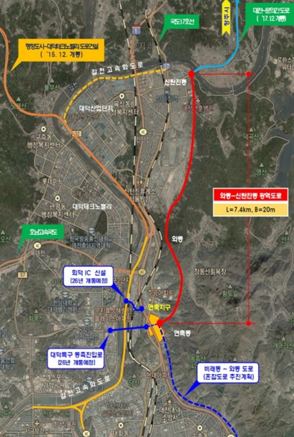 이번 도로개설이 완료되면 청주, 상주, 영덕 등 대전 북동부 방면 광역 이동성이 크게 개선되고, 대덕구 일대 국도 17호선의 상시 정체 구간 해소에도 실질적인 도움이 될 것으로 기대된다. 특히 대전 동북부 순환도로망 구축을 통해 지역 간 접근성이 향상되고, 산업․물류․정주 여건 개선 효과도 클 것으로 전망된다.