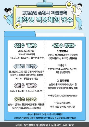 ![]() 순천시, 2026년 겨울방학 대학생 직장체험 연수생 모집 |