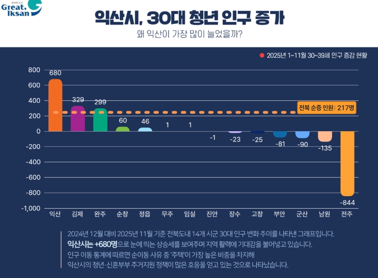 ![]() 전북 14개 시군 중 30대 인구 유입 1위 |