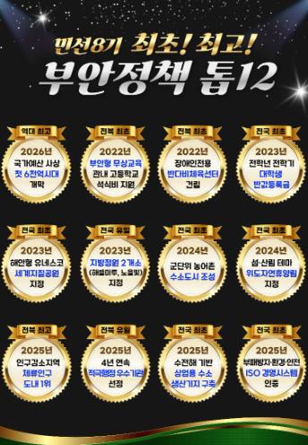 최초·최고 부안정책 톱12는 전국 최초·전국 유일·전북 최고 등 객관적이고 대외적으로 입증된 성과를 중심으로 선정됐으며 민선 8기 부안군정이 지향해 온 변화의 방향성과 정책 철학을 압축적으로 보여준다.