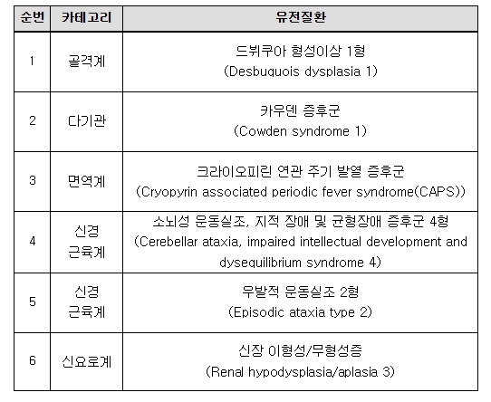 ![]() 배아‧태아 대상 유전자검사 신규 질환 목록(6개) |
