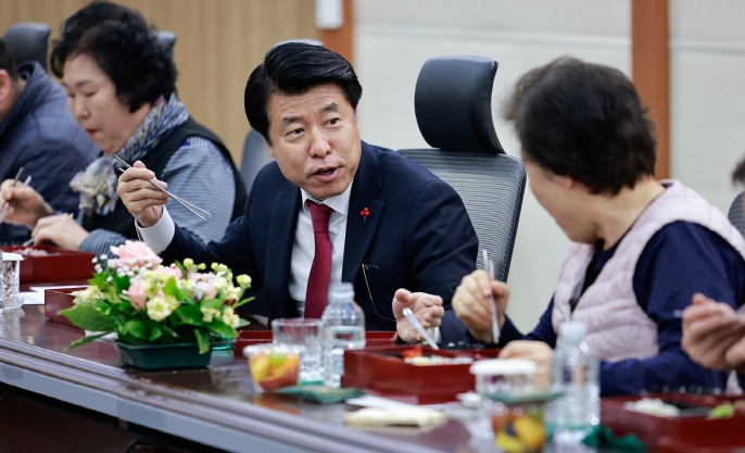 ![]() 서강석 송파구청장이 2026년 1월 2일 구청 소회의실에서 청사관리 근무자들과 점심을 먹으며 이야기를 나누고 있다. |