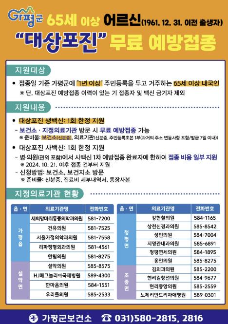 ![]() 가평군, 65세 이상 어르신 대상포진 무료 접종 |