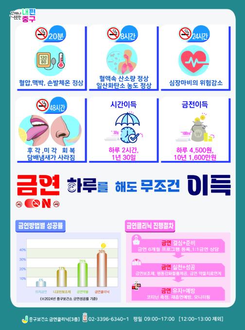 이런 밀착지원 덕분에 중구의 금연 성공률은 2024년 36.1%에서 지난해 38.4%로 2.3%p 상승하며 자치구 금연클리닉 평균인 31.1%(24년 기준)를 훌쩍 넘었다. 아울러, 개인의 의지만으로 금연에 성공한 경우와 비교하면, 금연클리닉 이용 시 성공률은 약 9배 이상 높은 것으로 나타났다.