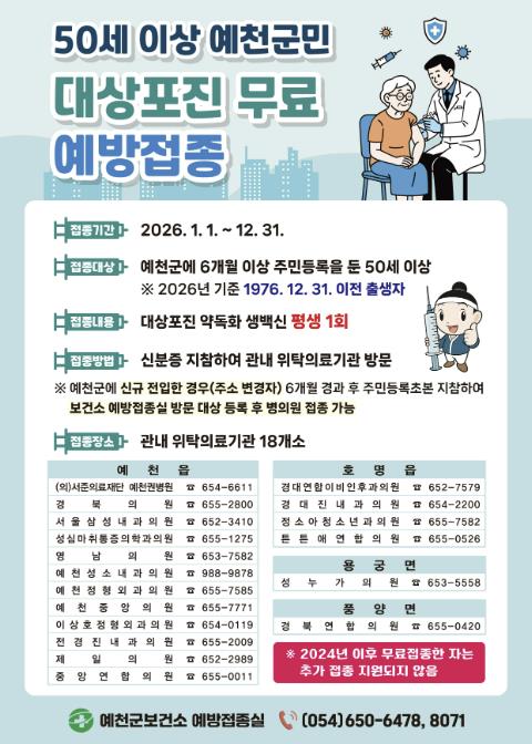 ![]() 예천군, 2026년 50세 이상 대상포진 무료 예방접종 실시 |