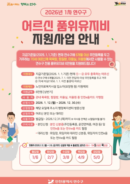 올해 1차 지원 대상은 1956년 1월 1일 이전 출생자로, 2025년 7월 1일 이전부터 연수구에 거주해 온 어르신들이다.