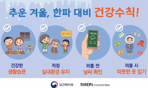 겨울철 한파 대비 건강 수칙으로는 △실내 적정 온도(18~20℃) 및 습도(40~60%) 유지 △ 외출 전 체감온도 확인 △ 외출 시 방한용품 착용 등이 있다.