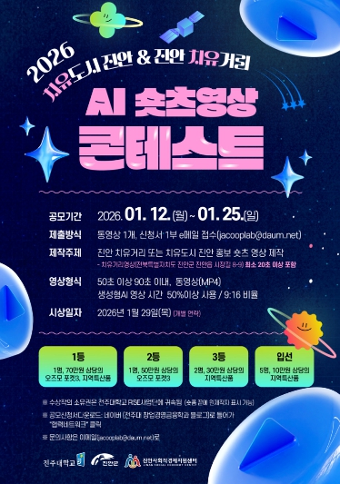 공모 기간은 2026년 1월 12일부터 1월 25일까지이며, 참가자는 ‘치유도시 진안’ 또는 ‘진안 치유거리’를 주제로 한 숏츠 영상을 제작해 이메일로 제출하면 된다.