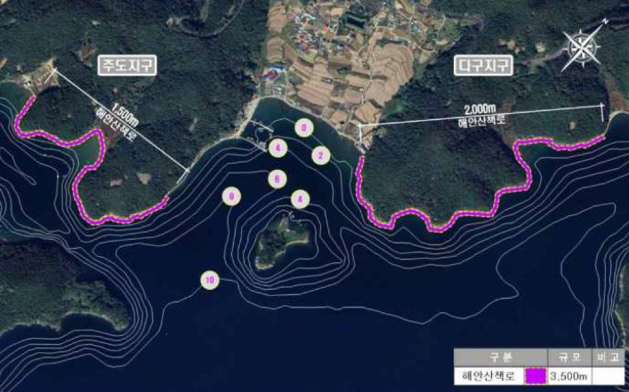 창원 주도·다구지구는 진동면 요장리~다구리 일원에 해안산책로(L=3,500m)를 조성하는 사업이다. 대상지는 남파랑 둘레길(남파랑길 11코스)에 해당해 이용객이 증가하는 곳이나, 해안산책로가 단절돼 있어 지역 주민과 관광객들에게 불편과 위험을 초래하고 있었다.