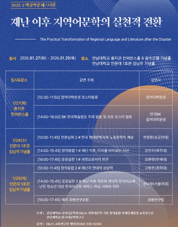 전남대 국문과 BK 참여대학원생의 포스터발표뿐만 아니라, BK 전국학술캠프도 더불어 개최할 예정이어서 전국 BK 참여대학과의 교류와 재난 관련 연구의 활발한 소통이 이루어질 것으로 기대된다.