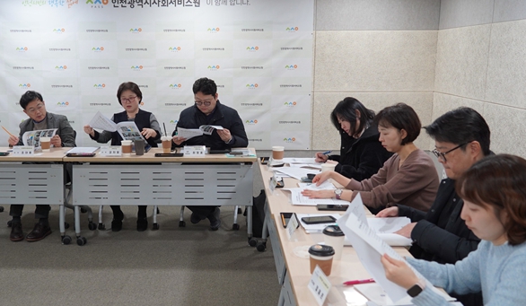 ![]() 인천시사회서비스원은 최근 2026년 연구과제 선정을 위한 연구심의위원회를 열고 참석 위원들과 자료를 검토하고 있다. |