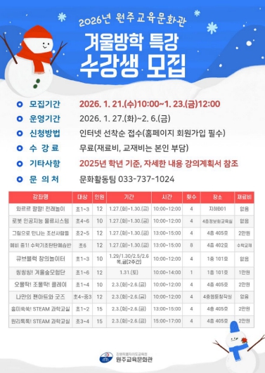 ![]() 원주교육문화관, 겨울방학 특강 수강생 모집 |