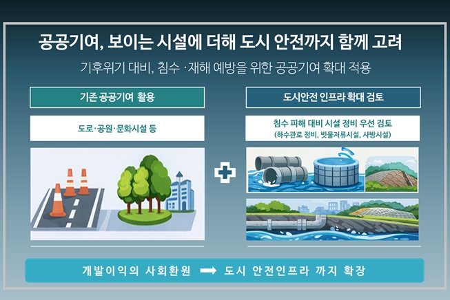 개발이익을 사회에 환원하는 ‘공공기여’ 제도를 통해 지금까지는 주로 도로·공원·문화시설 등 직접적인 공공 생활 인프라를 확충해 왔으나 시는 앞으로 활용 범위를 확대, 하수도 정비 등 안전 인프라에 우선 적용한다는 계획이다.