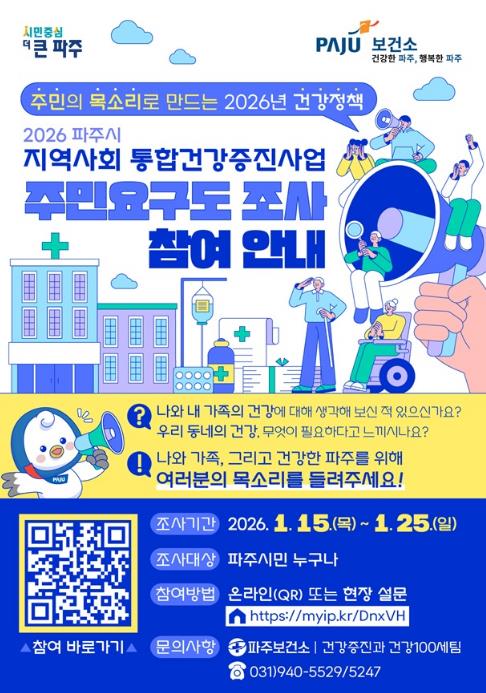 ![]() 파주시, 2026년 지역사회 통합건강증진사업 주민건강요구도 조사 실시 |