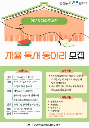 모집 기간은 1월 21일부터 2월 13일까지이며 자세한 사항은 계양도서관 누리집 공지사항을 참고하거나 독서문화과로 문의하면 된다.