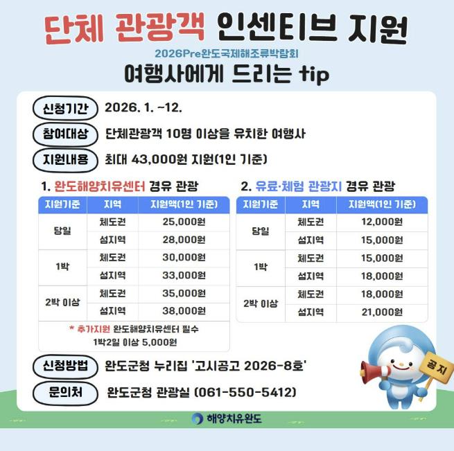 지원 기준은 내・외국인 단체 관광객 10명 이상 유치 시 당일 기준 체도(육지)권은 1인 당 12,000원, 섬 지역은 15,000원이 지원된다.