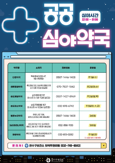 연수구 관계자는 “공공심야약국은 야간 시간대 구민 건강을 지키는 지역 의료안전망”이라며 “앞으로도 주민들이 필요할 때 언제든지 도움받을 수 있도록 안정적인 운영에 힘쓰겠다.”라고 밝혔다.