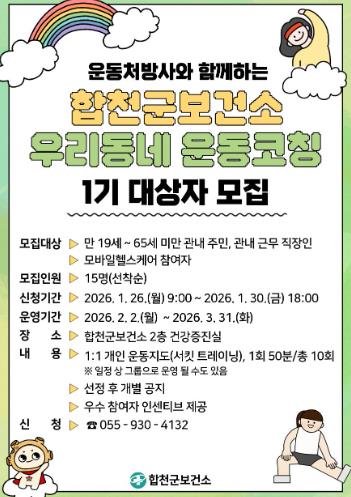 ![]() 합천군 보건소, 『우리 동네 운동코칭 : PT with U』 1기 참여자 모집 |