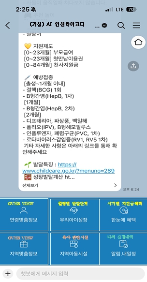 이번 서비스는 가정양육 영유아 부모를 대상으로 발달단계별 성장 정보부터 각종 지원금, 지역별 부모교육 및 행사, 장난감 대여 정보까지 흩어져 있는 육아 정보를 하나로 통합해 제공하는 것이 핵심이다. 별도의 애플리케이션이나 누리집 구축하지 않고 카카오톡 챗봇을 자체 제작해 비용 부담을 최소화했다.