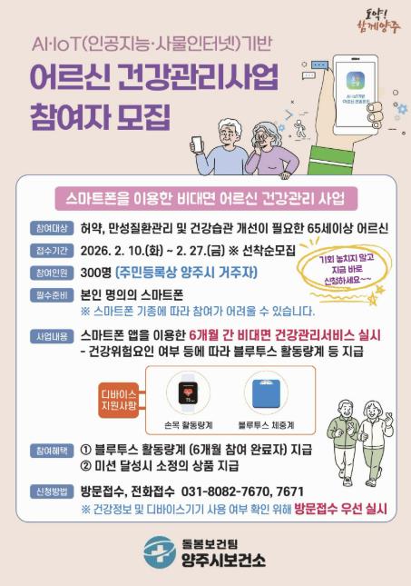 ![]() 양주시, 인공지능(AI)·사물인터넷(IoT) 활용 어르신 건강관리사업 참여자 모집 |