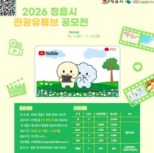 ![]() "정읍의 사계절을 담아주세요”...2026 관광 유튜브 공모전 개최 |