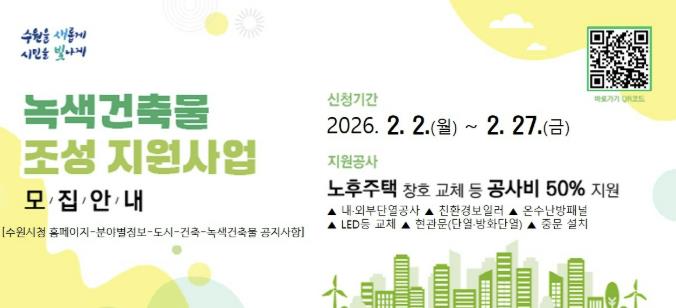 수원시 홈페이지 검색창에서 ‘2026년 녹색건축물 조성지원사업’을 검색해 신청서를 내려받아 작성한 후 사업계획서, 내역서 등 서류와 함께 수원시청 건축과에 방문·등기우편으로 제출해야 한다. 등기우편은 2월 27일 자 소인까지 유효하다.