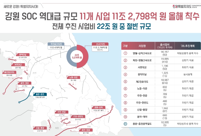 김진태 지사는 “강원도의 SOC 사업이 순항 중인 가운데, 올해 대형 SOC 사업 11개가 총 11조 원 규모로 착수된다”며, “이미 추진 중인 사업만 해도 29개, 11조 원에 달한다”고 밝혔다.