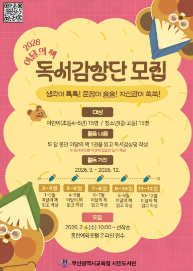 한편, 부산시교육청은 매월 학생들이 직접 추천하고 선정하는 ‘우리가 뽑은 이달의 책’ 프로그램을 운영하고 있다. 어린이 부문, 청소년 부문 각 1권씩 선정하며, 사업과 연계해 작가 강연, 글쓰기 강좌, 이달의 책 전시 등 다양한 프로그램을 운영한다.