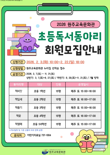 ![]() 원주교육문화관, 2026년 독서동아리 회원 모집 |