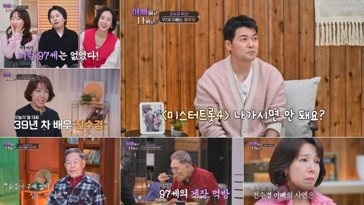 2월 4일(수) 방송되는 TV CHOSUN '아빠하고 나하고 시즌3'에는 1세대 원조 뮤지컬 스타이자 팔색조 매력의 39년 차 배우 전수경이 새로운 딸 대표로 합류한다. 전수경의 아버지는 1930년생으로, 일제강점기·광복·한국전쟁·베트남전까지 한국의 근현대사 그 자체를 겪고 97세가 됐다.