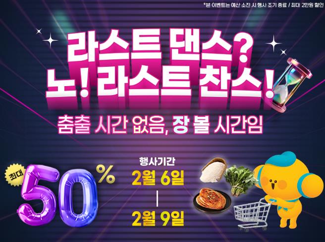 이번 기획전은 명절 직전까지 바쁜 일상으로 장보기에 여유가 없었던 소비자를 겨냥해 “라스트 댄스? 노! 라스트 찬스!_춤출 시간없음, 장 볼 시간임”이라는 유쾌한 콘셉트로 기획됐으며, 설 상차림에 필요한 고흥산 농수축특산물을 최대 50% 할인된 가격으로 선보인다.