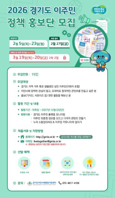 선발된 홍보단은 2026년 3월부터 2027년 12월까지 약 2년간 활동하며 경기도 이주민 플랫폼에 탑재될 콘텐츠를 일부 기획·제작하게 된다. 또한, SNS를 활용해 직접 취재한 이주민 주요 정책 내용을 다국어로 홍보하는 역할도 맡는다.