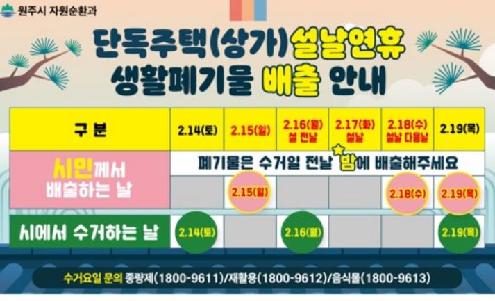 장성미 자원순환과장은 “연휴 기간 생활폐기물 수거 일정을 참고하셔서 깨끗한 원주시를 함께 만들어 주시길 바란다”라고 말했다.