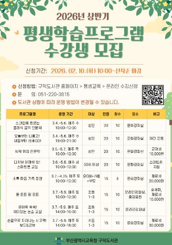 최인혜 구덕도서관장은 “이번 프로그램을 통해 지역 주민들이 배움의 즐거움을 경험하고 평생학습 역량을 키우길 바란다”며 “앞으로도 다양한 교육을 운영해 지역사회 평생교육을 활성화 하겠다”고 말했다.