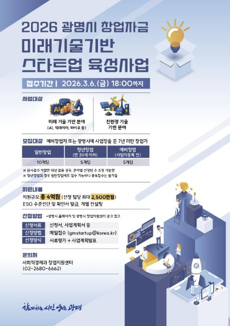 ![]() 2026 광명시 창업자금 미래기술기반 스타트업 육성사업 모집 안내문. |