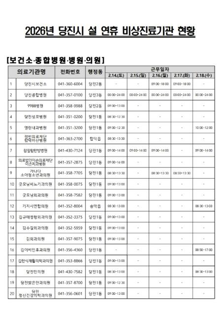 이번 연휴 기간 중 당진종합병원 응급실은 24시간 비상진료 체계를 유지하며, 시민들의 진료 편의를 위해 관내 병의원 70여 개소와 약국 30여 개소가 지정된 날짜에 문을 연다.