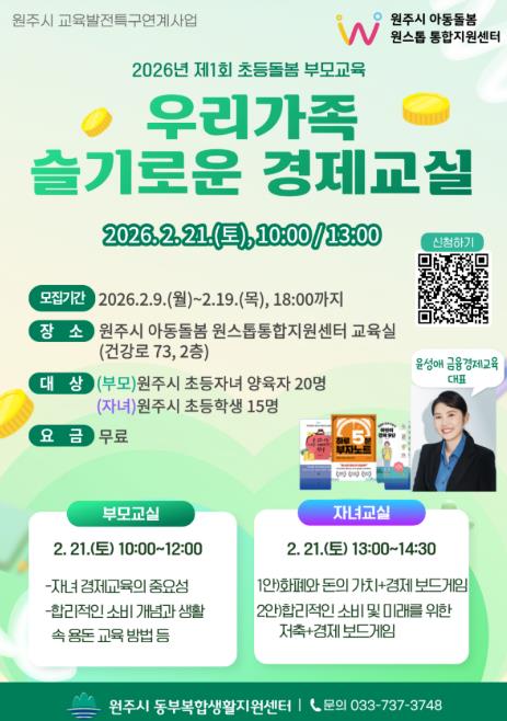 이번 부모 교육은 풍부한 현장 경험과 전문성을 겸비한 금융교육 전문가인 윤성애 금융경제교육 대표가 강사로 나서, 가족 눈높이에 맞춘 실질적인 경제 지식을 전달할 예정이다.