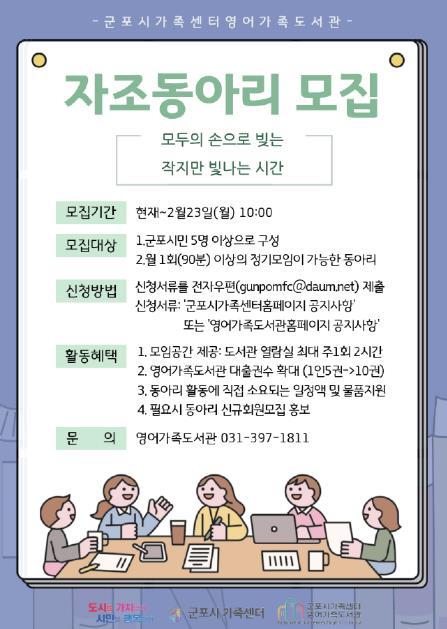 모집 대상은 군포시민으로 구성된 5인 이상의 자발적인 모임으로, 월 1회 이상 정기적인 활동이 가능한 동아리라면 신청할 수 있다. 활동 주제는 독서, 가족, 도서관, 다문화·다국어 등 영어가족도서관과 가족센터의 가치에 부합하는 내용이면 가능하다.