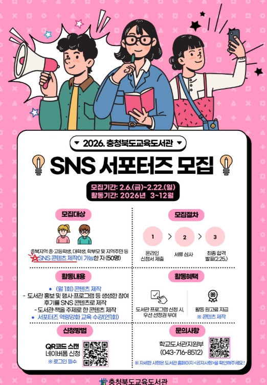모집 분야는 ▲기사형 콘텐츠 ▲삽화‧만화 ▲영상 제작 등 3개 분야이며, 개인 SNS 계정을 보유하고 콘텐츠 제작이 가능한 충북 도내 중‧고등학생, 대학생, 학부모 및 지역주민이면 누구나 지원할 수 있다.