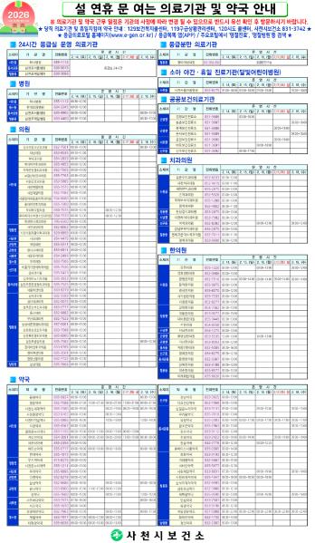 사천시보건소 관계자는 “설 명절 동안 시민들이 안심하고 연휴를 즐길 수 있도록 비상진료체계 유지에 만전을 기하고 있다”며, “의료 이용에 불편함이 없도록 행정적 지원을 아끼지 않겠다” 고 말했다.