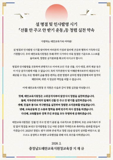 ![]() 태안교육지원청, 설 명절 맞아 ‘선물 안 주고 안 받기’ 청렴서한문 발표 |