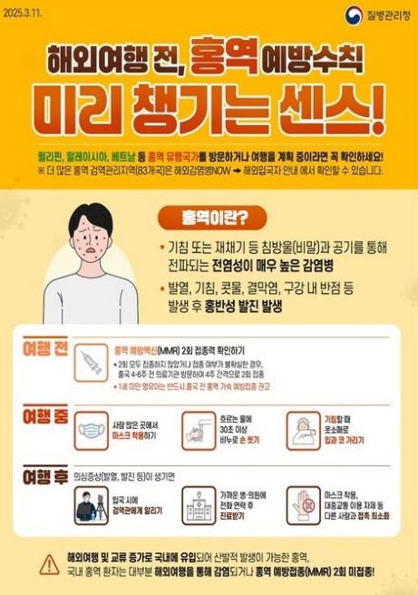 우리나라처럼 평소 홍역 발생이 거의 없는 국가에서도 해외 유입 사례로 인해 지역사회 전파 위험이 커지고 있어 여행 전 예방접종의 중요성이 더욱 강조되고 있다.