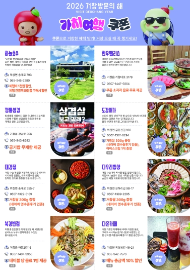 가치여행 쿠폰북은 거창군 문화관광포털 '2026 거창방문의 해' 코너에서 신청 가능하며 3대 관광지인 항노화힐링랜드, 거창창포원, 수승대관광지에서도 수령할 수 있다. 관광객들은 이를 통해 거창 곳곳의 가치 있는 여행지와 지역 상권을 자연스럽게 경험할 수 있다. 참여업체에도 실질적인 홍보 효과와 재방문 유도라는 긍정적인 성과가 기대된다.