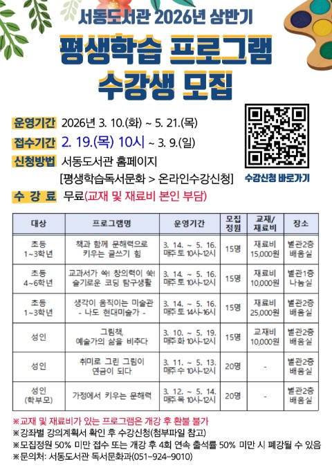 ![]() '서동도서관 2026년 상반기 평생학습 프로그램 수강생 모집' 포스터 |