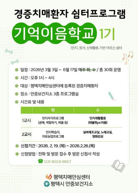 이번 프로그램은 매주 화·수 주 2회, 총 30회기로 진행되며 운영시간은 오후 1시부터 4시까지다. 대상은 평택치매안심센터에 등록된 경증 치매 환자이며, 프로그램은 안중보건지소 3층 프로그램실에서 운영된다. 모집 인원은 10명이다.