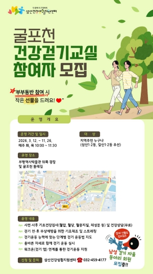 ![]() 부평구보건소 삼산건강생활지원센터, 주민과 함께 만드는‘삼산동 걷기 좋은 길’코스 발굴 및 신체활동 프로그램 참여자 모집 |
