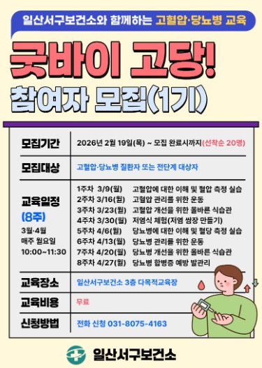 2026년 고혈압·당뇨병 교육상담 표준화 사업의 일환으로 진행되는‘굿바이 고당! 교실’은 고혈압·당뇨병 질환자 또는 전단계 대상자를 모집하며, 간호사·운동처방사·영양사 세 분야의 전문가가 이론과 실습을 병행해 교육할 예정이다.