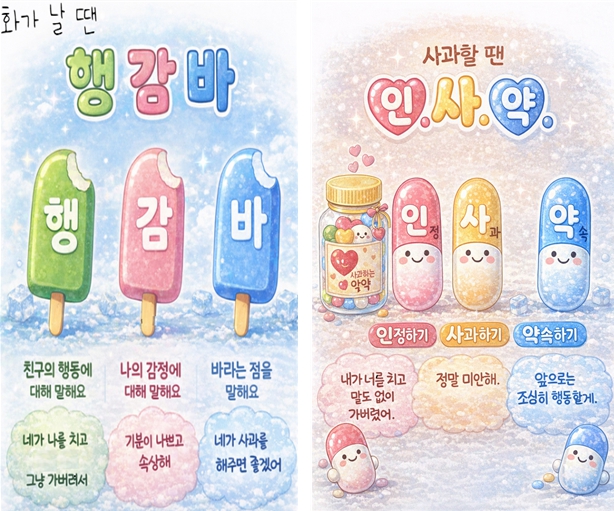 ![]() ‘행감바 인사약 포스터’는 인성교육 꾸러미 자료 중 하나로 학생들이 화가날 때 사과할 때 대화하는 방법을 이미지와 글로 나타낸 자료이다. |