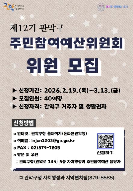 ![]() 관악구 제12기 주민참여예산위원회 위원 모집 홍보 포스터 |