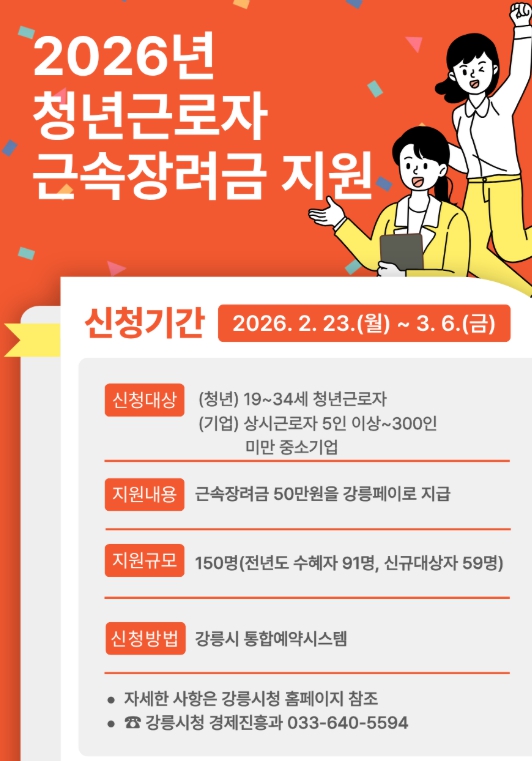 근속장려금 신청은 오는 23일부터 3월 6일까지이며, ‘강릉시 통합예약시스템’을 통해 청년 근로자 본인이 신청하면 된다.